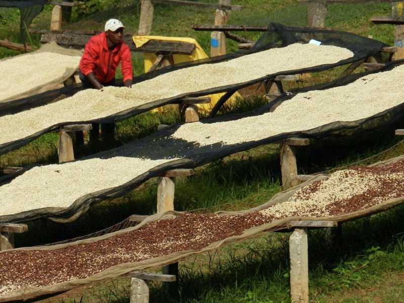 Drying tables at Gahahe Station showing washed coffee on the rear 3 tables