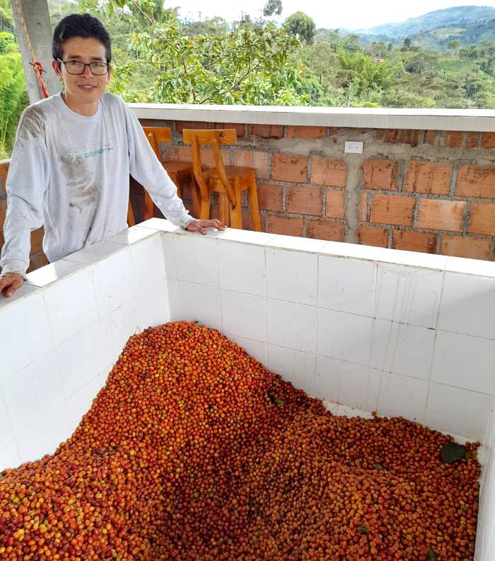 Eduardo Armero is a coffee grower from Narino with considerable experience in high quality coffee production despite his young appearance. He started this new project in Huila two years ago and the coffee has already attracted a good deal of attention. His 6 hectare farm produces a total of 100 bags a year of various varieties, spread of two harvest seasons. The main season in this area is from May - August with the smaller crop from October - January. About 20% of the farm has shade coverage. Like many better managed coffee farms, only fully ripe fruit is harvested here.